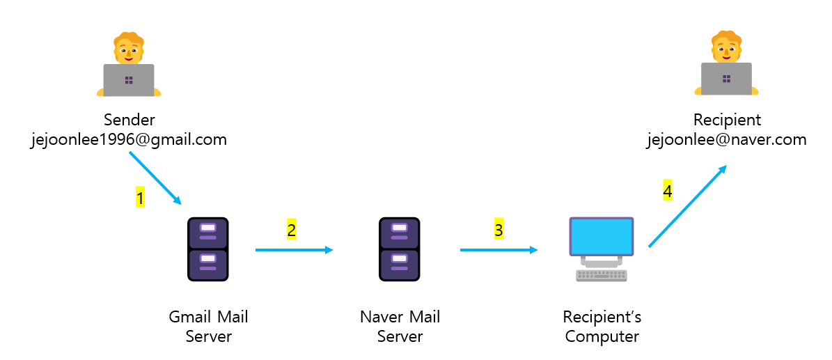 - 그리고 Naver Mail 서버에서는, 수신자의 컴퓨터로 이메일을 보낸다