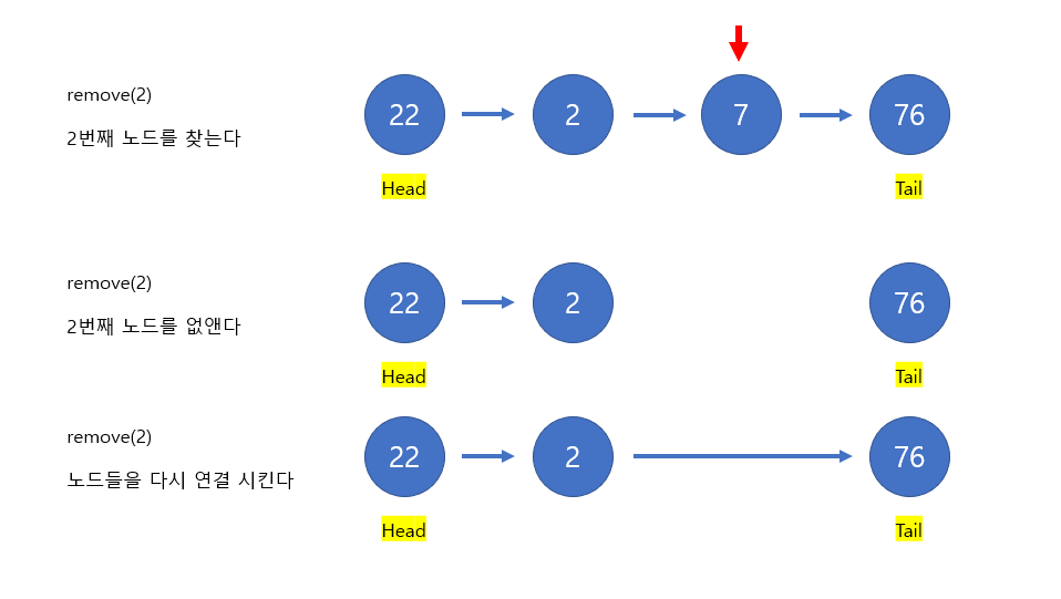 77이 들어갈 자리를 먼저 찾는다 (get(index-1))22와2사이에 들어가야 함으로, 새로운 노드를 생성한다2를 임시 변수에 저장을 한다22의 다음 노드를 새로운 노드와 연결한다- 새로운 노드의 다음 노드를