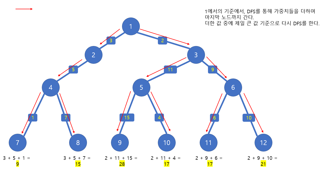 ธ๋๋ฅผ ์์์ผ๋ก DFS๋ฅผ ํ์ฌ, ์ ์ผ ํฐ ๊ฐ์ค์น๋ฅผ ๊ตฌํ๋ค