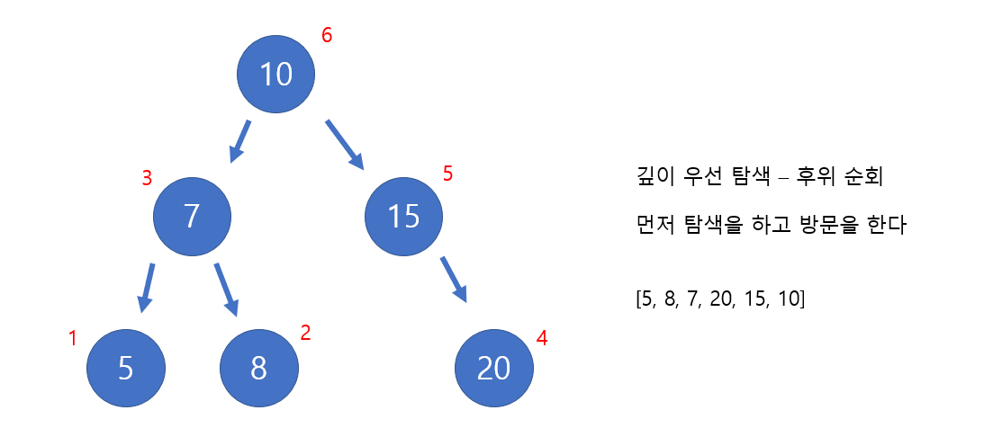 • 즉 왼쪽 기준 제일 하단에 있는 노드들을 방문하고, 올라오면서 오른쪽에 노드가 있으면, 그 노드를 방문한다