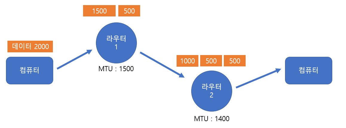 - 즉 패킷이 MTU 보다 더 크면, 중간에 패킷이 더 쪼개지거나, 에러가 발생할 수 있다