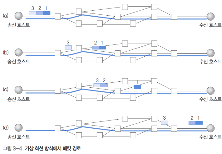 - 가상의 회로를 설정하고, 그 경로대로 패킷을 순서대로 보낸다