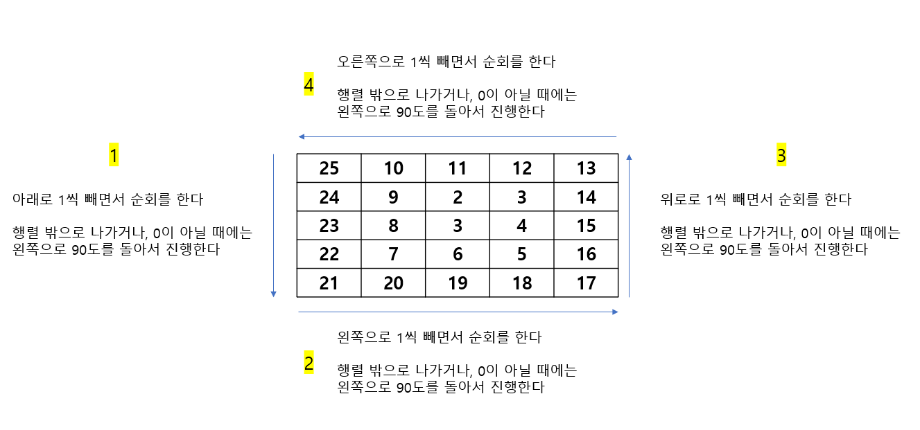 만약에 다음 좌표가 0이 아니거나, 행렬을 나가게 된다면 왼쪽으로 90도를 돌아서 앞으로 가면서 -1을 하면 된다