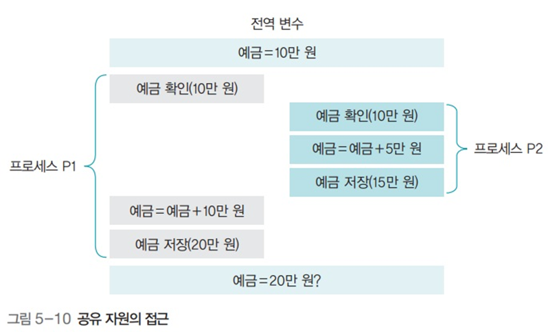 - 하지만 프로세스 P1과 프로세스 P2가 동시에 접근하면서, 타이밍이 꼬여 20만원으로 결과값이 나왔다