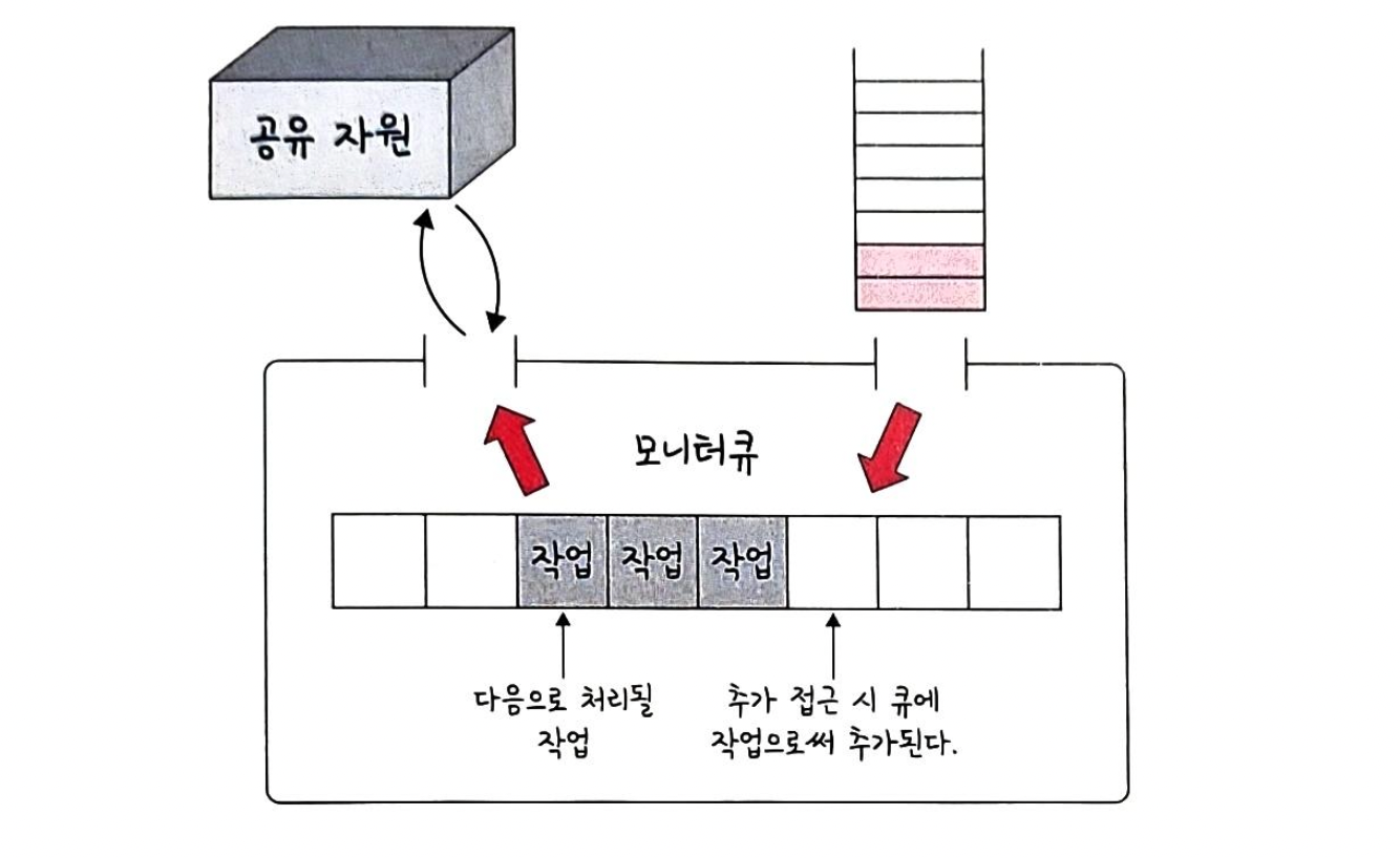 - 모니터 큐에서 프로세스들을 관리하고, 순차적으로 공유 자원에 접근 할 수 있도록 해준다