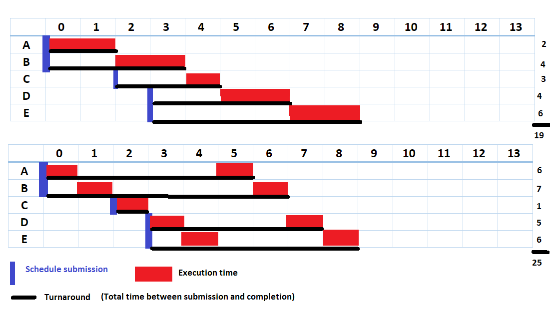 - 예) 아래 이미지에서 A, B, C, D, E가 있고 모두 라운드 로빈을 통해 1초씩 실행 시간이 할당이 된다