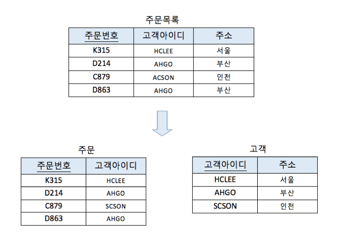 정규화 과정은 테이블/릴레이션을 나누는 것이다