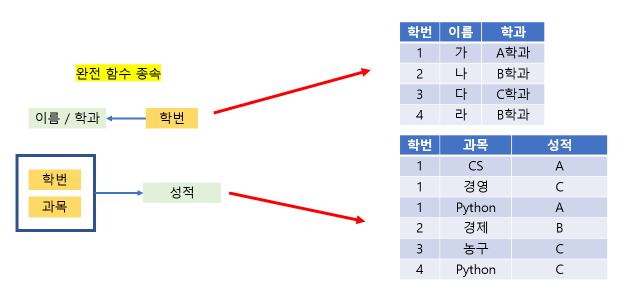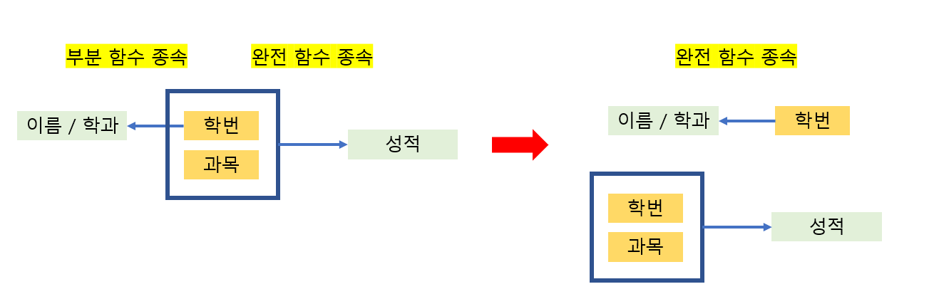 - 전에는 성적은 {학번, 과목}의 완전 함수 종속이었고, '이름/학과'은 {학번, 과목}의 부분 함수 종속이었다