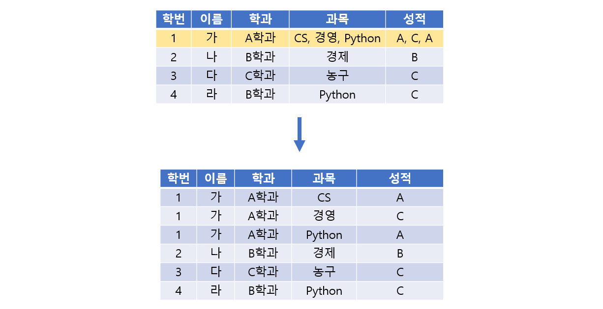 - 값들을 다른 레코드로, 분리해서 다시 테이블을 만든다