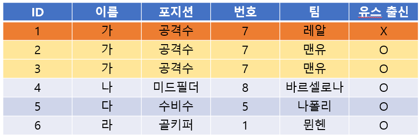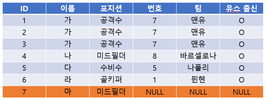 - 이때, 이름과 포지션만 등록하여, 번호, 팀, 유스 출신에는 NULL 값으로, 불필요한 데이터가 추가됬다