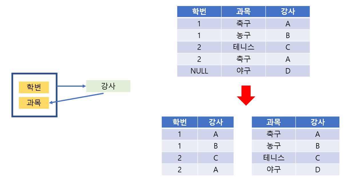 - 강사는 후보키가 아니지만, 과목을 결정하는 결정자 역할을 한다
