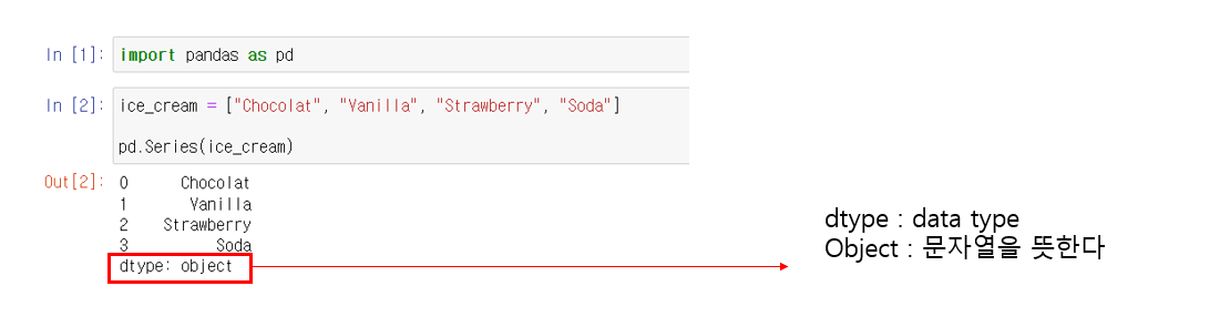 - 값은 똑같이 값에 들어가고, dtype도 모든 값이 문자열이라서, object로 지정되어 있다