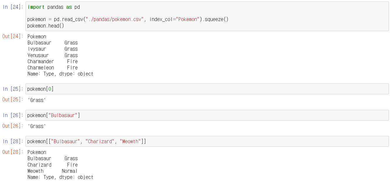 - pokemon[["Bulbasaur", "Charizard", "Meowth"]]는 3개의 값들을 모두 출력해준다