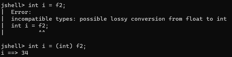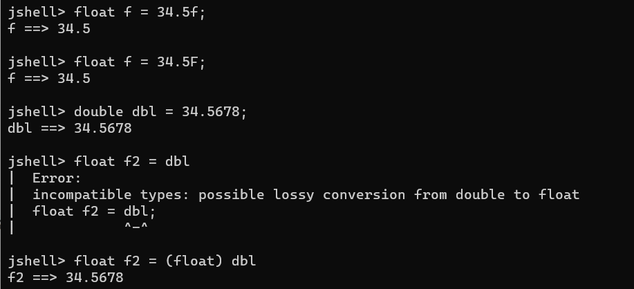 - float f2 = (float) dbl : dbl을 float로 형변환을 시켜줘야 한다
