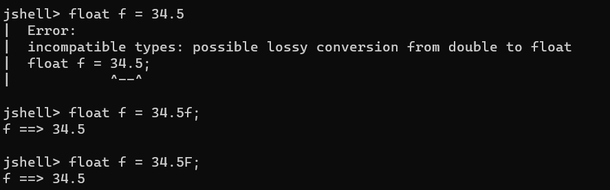- 그래서 float로 저장할 때에는, f 나 F 를 숫자 마지막에 포함해야 한다