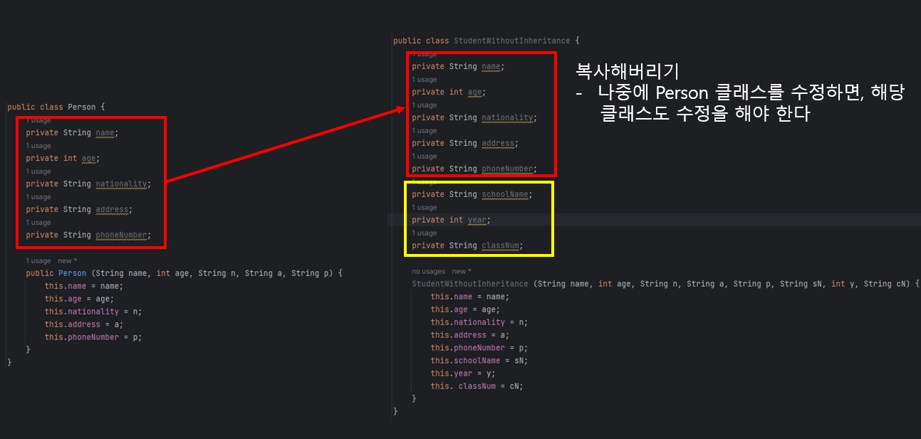 - 위와 같이 하게 된다면, 변경 사항이 있을 때에는 Person 클래스만 변경을 하면, 다른 상속 클래스들도 자동으로 변경이 된다