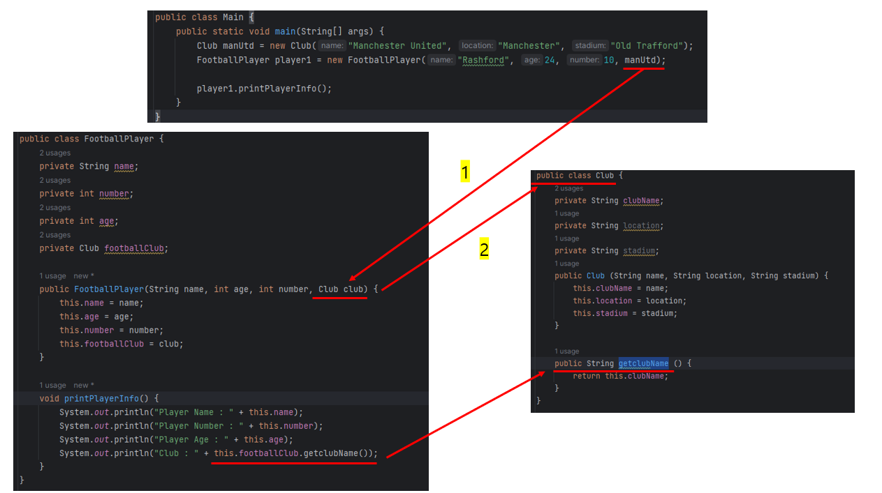 - player1 은 FootballPlayer 클래스를 통해 만든 객체이고, 해당 클래스 내에서는 Club 객체를 넣어야 한다