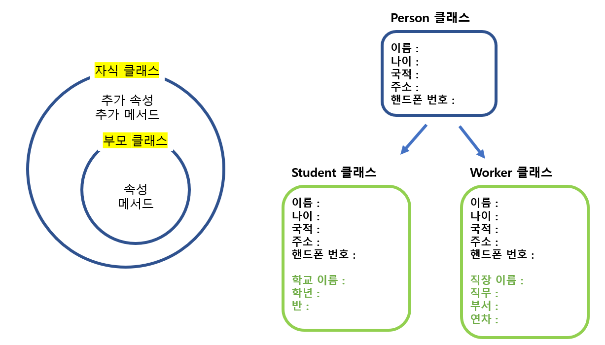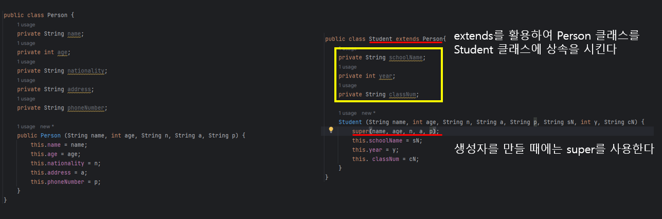 - 위의 Person 클래스에 있는 속성들을 가지고, Student 또는 Worker 클래스에 넣고, 추가로 필요한 속성을 만들면 된다