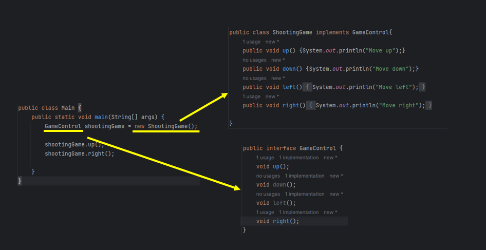 GameControl 인터페이스를 가지고 오고, ShootingGame() 의 클래스의 객체를 만들었다