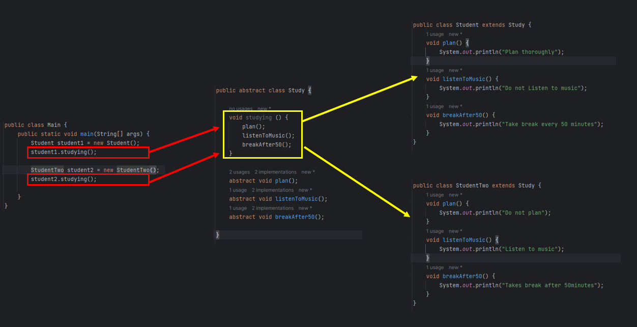 위처럼, 큰 틀에서는 같은 행동을 하지만, 자세한 부분에서 차이점이 있으면, 추상화를 통해 큰 틀을 만들고, 그 클을 자식 클래스에 상속 시키면 된다