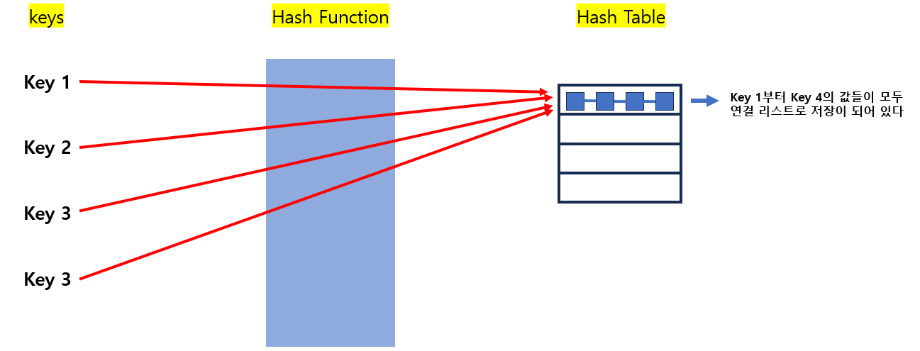 - 위에서 Key 1을 함수를 통해 나온 값과 Key 2를 해시 함수를 통해 나온 값이 동일하게 나온다면 충돌이 일어난다