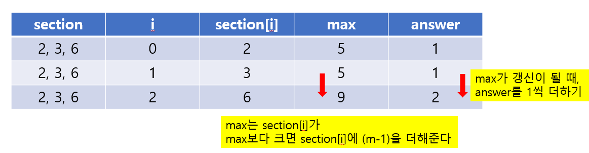 처음에 section[0] + (m - 1) 을 하여 max를 구해주고, 그 이후 계속 갱신을 시켜주면 몇 번의 페인트 칠을 해야 하는지 구해준다