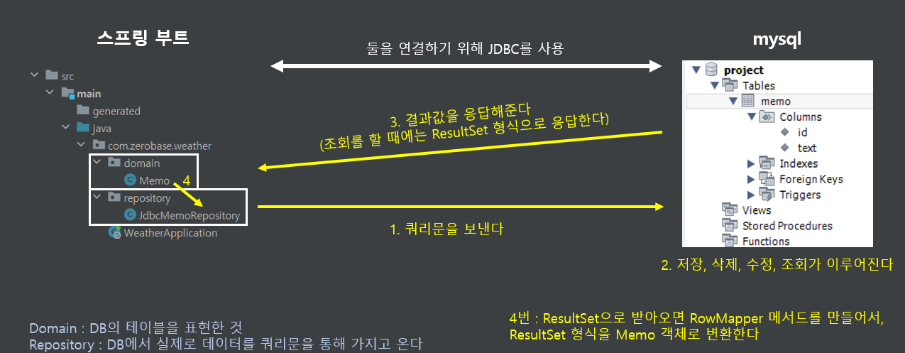 쿼리 수행 결과와 객체를 매핑한다 (쿼리를 가지고 Spring Boot와 DB가 연결이 된다)