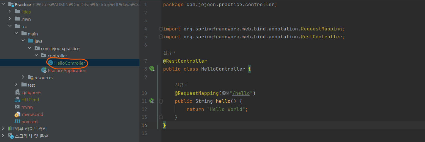 - 왼쪽 프로젝트 바에, main/java/com.Example.hello 루트에 오른쪽 클릭을 한다