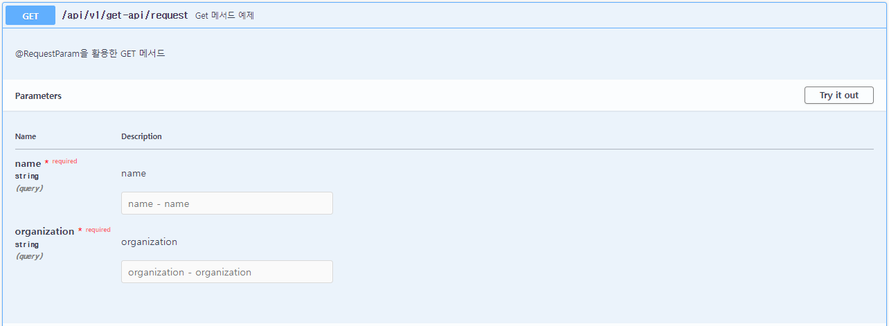 추가로 Try it out 버튼을 누르면 해당 API를 테스트 할 수 있다