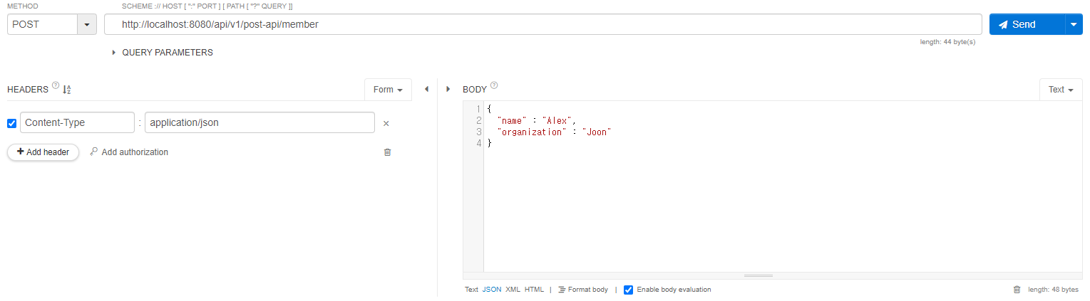 http://localhost:8080/api/v1/post-api/member 를 작성하고, Body에 name과 organization에 대한 값을 넣어서 요청을 보내면 된다