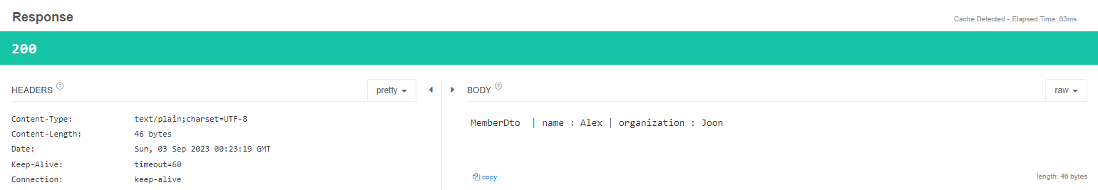 - MemberDto에서 만든 속성들 name, organization을 키 값으로 사용하여, URL에서 그 안의 값을 넣어주면 된다