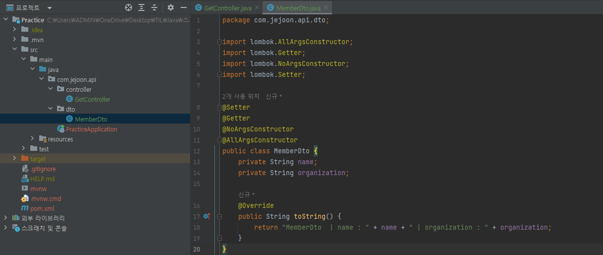 - lombok를 이용하여 생성자, Setter, Getter를 만들었다