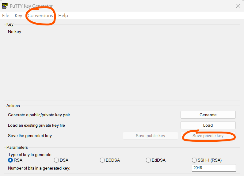 - Conversions -> Import Key (aws에서 받은 .pem 파일을 선택한다)