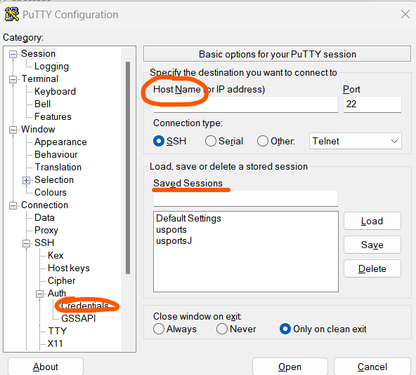 - Saved Sessions에 세션 이름을 원하는대로 입력해준다