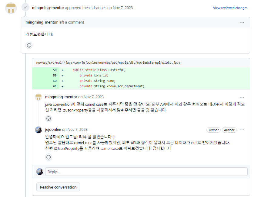 그런 점에서, 현업에 계신 멘토분들이 '나의 코드'를 보며 직접 리뷰를 남겨주신 점이 더 전문성이 있었다.