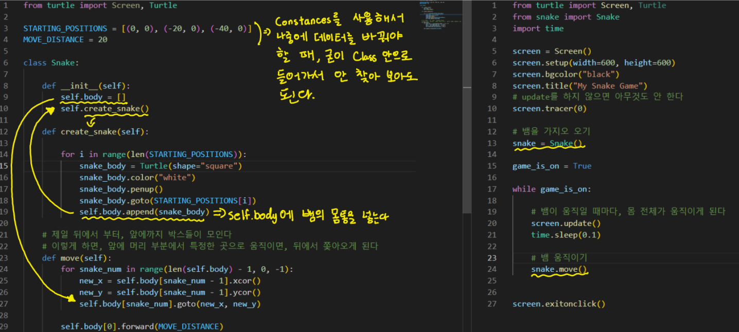 뱀의 형태, 그리고 움직임을 작동시키는 class를 만든 파일
