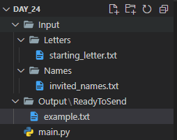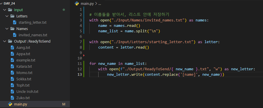 starting_letter.txt 의 내용에 있는 비어있는 이름들을 invited_names.txt의 이름들로 바꿔서, 이름 별로 Output 폴더에 파일을 만드는 것이다