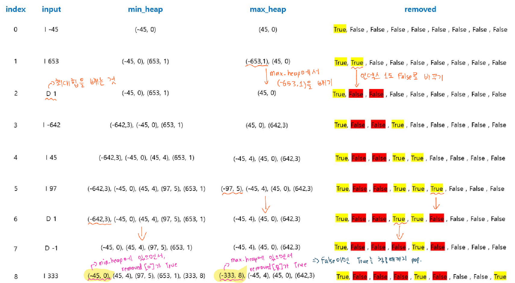 I 는 힙에 숫자를 넣는 것 / D 1 최대 힙에서 숫자를 하나 빼는 것 / D -1 최소 힙에서 숫자를 하나 빼는 것