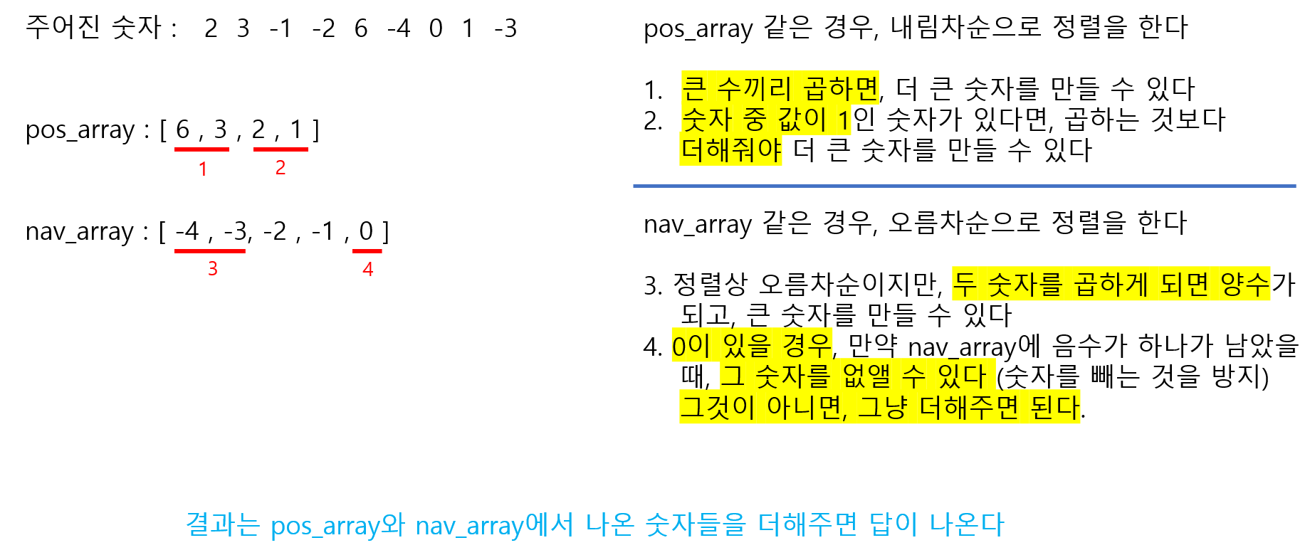 공통적인 것은 양수 리스트와 음수 리스트에서 리스트 앞에 숫자를 2개를 꺼낼 수 있으면, 그 숫자들을 곱해서 pos_ans와 nav_ans에 더해준다