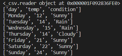 <_csv.reader object at 0x000001F092836FE0>,csv.reader()를 사용해서 데이터를 끌어왔을 때- 그 밑에는 for문으로