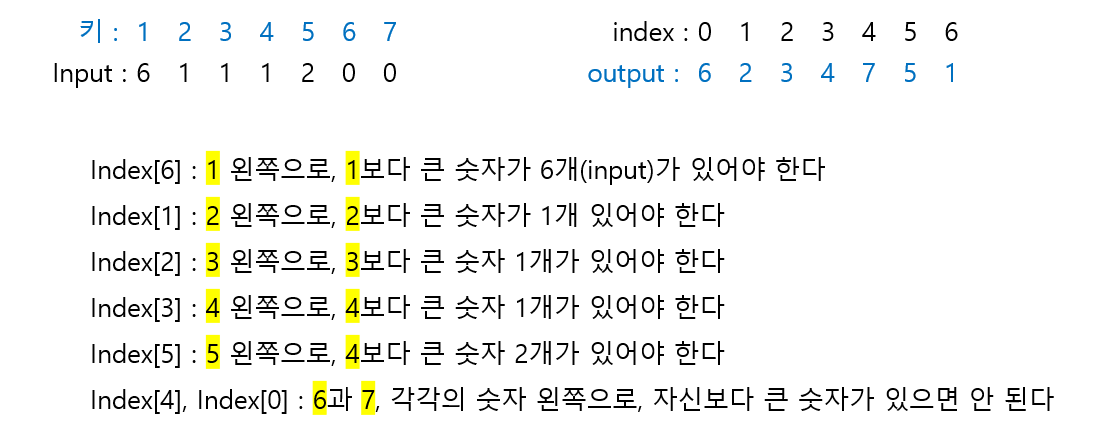 입력값은 서있는 사람의 기준으로 왼쪽에, 자신보다 키가 큰 사람의 숫자를 의미한다