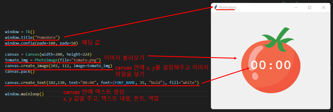 starttimer()을 누르면countdown()이 시작한다countdown()은.itemconfig()를 통해 토마토 중앙에 있는 글을 바꾼다- 바꿀 때에는 분과 초를 바꾸는 것