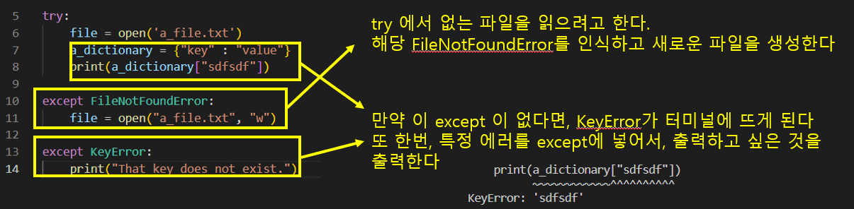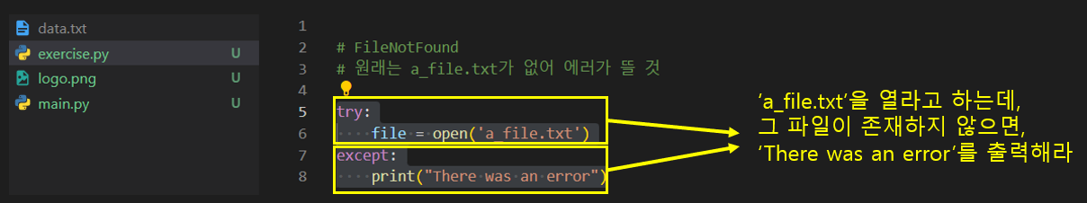 try: 파일을 열어보아라except: 파일을 찾지 못하면 "There was an error"를 출력하라try,except가 없으면 FileNotFound 에러가 뜰