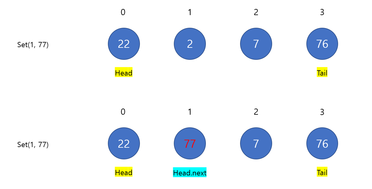 set(index, value) : 특정 노드를 찾고, 노드의 값을 value로 적은 값으로 수정하는 것