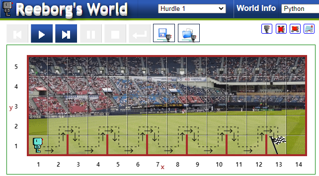 - https://reeborg.ca/reeborg.html?lang=en&mode=python&menu=worlds%2Fmenus%2Freeborg_intro_en.json&name=Hurdle%201&url=worlds%2Ftutorial_en%2Fhurdle1.json